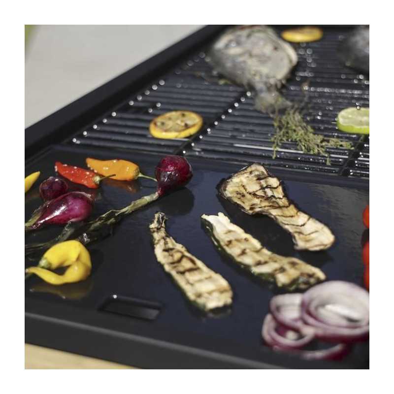 La barbacoa de gas de 4 fuegos COOK'IN GARDEN FLAVO es perfecta para comidas agradables. Con sus 4 quemadores de acero inoxidable y una potencia de 10 kW, ofrece una superficie de cocción de 76 x 40 cm compuesta por dos parrillas y una plancha de hierro fundido esmaltado. El encendido piezoeléctrico integrado y los botones con indicadores de calor facilitan su uso. Equipada con un cajón recogegrasas, una campana de doble pared con termómetro y tres estantes extraíbles, dos de los cuales con tablas de cortar de bambú, esta barbacoa es práctica y elegante.