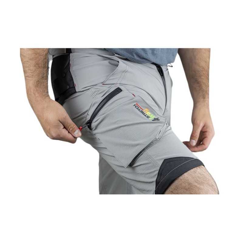The 4Way stretch Bermuda shorts from the LMA brand are designed to offer comfort and functionality during the warmer months. Equipped with a flexible plastic button with 4 holes measuring 20 mm in diameter and a plastic injected zip fly, these Bermuda shorts guarantee a reliable and durable closure. Its belt is equipped with 5 loops, including a wide one at the back with lumbar enhancement, an elasticated anti-slip band and extendable tabs for a personalized fit. The Italian pockets, as well as the thigh and back pockets with bellows, offer secure storage space thanks to flap and Velcro closures. The robust design of these Bermuda shorts includes 300D Oxford reinforcements on the semi-flying hammer holder and the bottom of the legs, as well as a crotch reinforcement in the main material, guaranteeing increased durability. The left and right thigh pockets are practical, with zip closures and specific openings for tools, such as the rule pocket. Embroidery on the front and back adds a neat finishing touch, while the shorter length allows for better ventilation during intense work days. LMA's 4Way stretch Bermuda shorts combine robust materials and a functional design, ideal for demanding work environments. Its multiple pockets and reinforcements make it a practical and durable choice for professionals looking for effective protection while maintaining great freedom of movement. Technical characteristics: 4-hole plastic button Button hole diameter: 20 mm Crotch length: 27 cm Materials: Ripstop 90% polyamide 10% elastane - 155 g/m² Reinforcements: Waterproof 300D Oxford 100% polyester - 175 g/m²Pockets: Italian pocketsLeft thigh pocket closed with flap and velcroOverpocket closed with zipRight thigh pocket with bellows, closed with zip, with ruler pocket openingLeft back pocket with bellows with flap closed with velcro