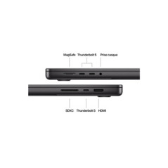 MacBook Apple Macbook Pro 16'''' 512 GB SSD 48 GB RAM M4 PRO CHIP CPU 14 CORE GPU 20 CORE SIDERAL BLACK Main characteristics: Processor brand: APPLE. Processor details: Apple M4 PRO 14 courses. Processor frequency: .. Member DAS index: 0.42 W/Kg. Trunk DAS index: 0.42 W/Kg.Repairability index: 7.1/10.Brand Graphics card: Apple.Details of the graphics card: Apple M4 PRO 20 courses.Maximum resolution: 3,456 x 2,234 pixels at 254 pixels per inch.Total storage: 512 GB SSD.SSD storage capacity: 512 GB.Memory size (RAM) Installed: 48 GB.Hard drive type: SSD.Screen specifications: 16.2-inch (diagonal) Liquid Retina XDR display2; native resolution of 3456 x 2234 pixels at 254 pixels per inch; XDR (Extreme Dynamic Range): 1,000,000:1 contrast ratio; XDR Brightness: 1,000 nits full-screen constant brightness, 1,600 nits peak brightness3 (HDR content only); SDR Brightness: Up to 1000 nits (outdoors); Color: 1 billion colors; Wide color gamut (P3); True Tone technology. Screen size (inches): 16 ''. Touch screen: No. Wireless communications: Wi-Fi 6E (802.11ax); Wi-Fi 6E available in supporting countries and regions., Bluetooth 5.3.Operating system: Mac OS.Battery type: 100 Wh lithium-polymer battery.Fast charging: Yes.Memory card reader: Yes.Color: Space black.Keyboard standard: Azerty.Backlit keyboard: Yes.Custom: No.Range: MacBook Pro.Weight: 2.14 kg.Number of built-in speakers: 6 High-fidelity six-speaker audio system with force-cancelling woofers.Other features: Built-in webcam 12 MP Center Stage camera with Desk View support; 1080p HD video recording; Advanced image signal processor with computer video processing, Integrated microphone Three-piece studio-quality microphone array with high signal-to-noise ratio and directional beamforming, Touch ID fingerprint reader, Force Touch trackpad for precise cursor control and pressure sensing capabilities; forced clicks, accelerators, pressure-sensitive drawing and Multi-Touch gestures. Additional features: Battery life and power: Up to 24 hours of video streaming; Up to 17 hours of wireless web browsing; 140W USB-C power adapter; USB C to MagSafe 3 cable; Charging and Expansion: 3.5mm headphone jack; MagSafe 3 port; Display: Simultaneous support for native resolution on the built-in billion-color display and: Up to two external displays up to 6K resolution at 60 Hz connected via Thunderbolt, or one external display up to 6K resolution at 60 Hz connected via Thunderbolt and one external display up to 4K resolution at 144 Hz connected via HDMI; An external display with 8K resolution at 60 Hz or an external display with 4K resolution at 240 Hz connected via HDMI; Video playback: Supported formats: HEVC, H.264, AV1 and ProRes; HDR with Dolby Vision, HDR10+/HDR10 and HLG; Audio playback: Supported formats: AAC, MP3, Apple Lossless, FLAC, Dolby Digital, Dolby Digital Plus and Dolby Atmos; Backlit Magic Keyboard with: 78 keys (US) or 79 keys (ISO) with 12 large function keys and 4 arrow keys (inverted T layout); Touch ID: Ambient light sensor; Force Touch trackpad for precise cursor control and pressure sensing capabilities; force clicks, accelerators, pressure-sensitive drawing and Multi Touch gestures; Audio: Wide stereo sound; Support for Spatial Audio when playing music or video with Dolby Atmos through the built-in speakers; Spatial audio with dynamic head tracking when using AirPods (3rd generation), AirPods 4, AirPods Pro, AirPods Pro 2, or AirPods Max; 3.5mm headphone jack with advanced support for high-impedance headphones; HDMI port supporting multi-channel audio output; Operating conditions: Voltage: 100 to 240 V AC; Frequency: 50 to 60 Hz; Operating temperature: 10 to 35°C; Storage temperature: -25 to 45°C; Relative humidity: 0 to 90% non-condensing; Maximum altitude: tested up to 3,000 meters; Maximum storage altitude: 4,500 m; Maximum transport altitude: 10,500 m; Screen: Refresh rate; ProMotion technology with adaptive refresh rate up to 120 Hz; Fixed refresh rates: 47.95 Hz, 48 Hz, 50 Hz, 59.94 Hz, 60 Hz. Origin of manufacture: Made outside Europe. Availability of spare parts: 7 years. Strong points: 16'' Liquid Retina XDR screen 3,456 x 2,234. M4 PRO CPU chip 14 GPU courses 20 courses. RAM: 48 GB - 512 GB SSD.Mac OS + Wi-Fi 6E (802.11ax) - Bluetooth 5.3.Main features: