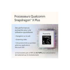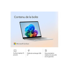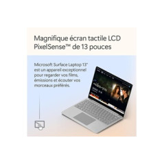 Microsoft Surface Laptop 13" Touch Screen Copilot+ Qualcomm Snapdragon hearts.Repairability index: 7.2/10.Total storage: 256 GB SSD.SSD storage capacity: 256 GB.Memory size (RAM) Installed: 16 GB.Hard drive type: SSD.Screen characteristics: PixelSense Flow Touch 13'', Technology: LCD, Resolution: 1920 x 1280 pixels, Anti-reflective panel.Size of screen (inches): 13 ''.Touch screen: Yes.Operating system: Microsoft Windows 11 Home.Color: Platinum.Keyboard standard: Azerty.Backlit keyboard: No.Customized: No.Width: 21.41 cm.Range: Surface Laptop.Depth: 1.56 cm.Weight: 1.24 kg.Accessories supplied: Cable USB-C, Quick start guide, Warranty information.PC Gamer: No.Additional features: Power supply sold separately.Country of manufacture: China.Origin of manufacture: Manufactured outside Europe..AI features: Yes.Availability of spare parts: 3 years.Highlights:PixelSense Flow Touchscreen 13", Technology: LCD, Resolution: 1920 x 1280 pixels, Panel anti-glare.Qualcomm Snapdragon